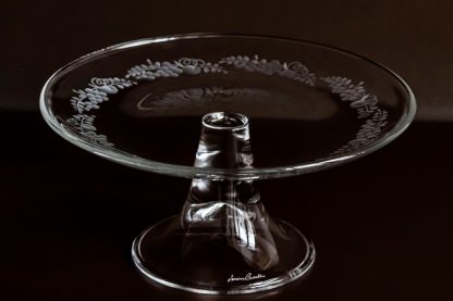 Elegant glass stand, diameter 28 cm, featuring a hand-engraved grape motif. Ideal for serving cakes, fruit, or floral arrangements. A versatile and thoughtful gift for any occasion.