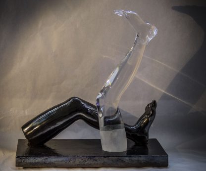 Sculpture “We walk”. Size: ceramic base 24×49, h4cm – crystal leg h50cm.